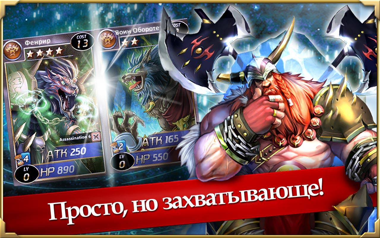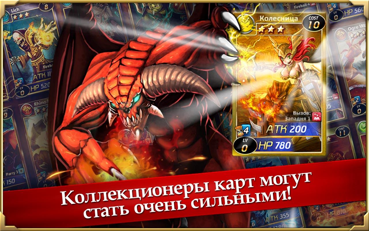 Карточная онлайн РПГ на андроид с красивой графикой. В игре собрано около трехсот карт с различными героями. Параметры карты и героя можно улучшать по ходу игры. В игре присутствует режим PvP с возможностью соединять игроков в кланы. Эти кланы борются между друг другом за территорию. Для успешной игры вам придется выработать собственную стратегию, иначе вам не выжить.