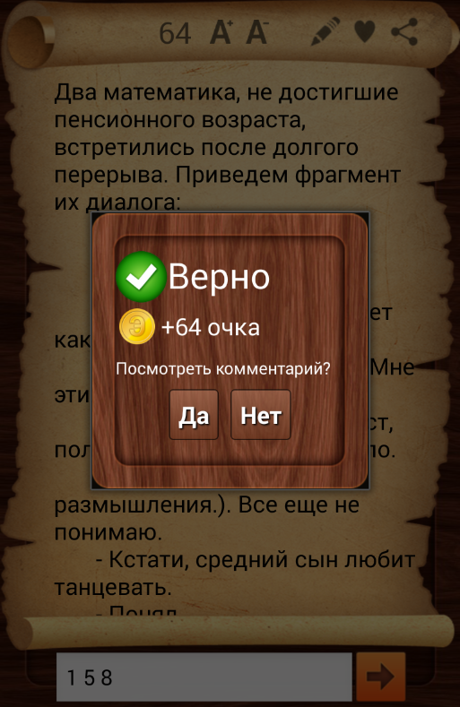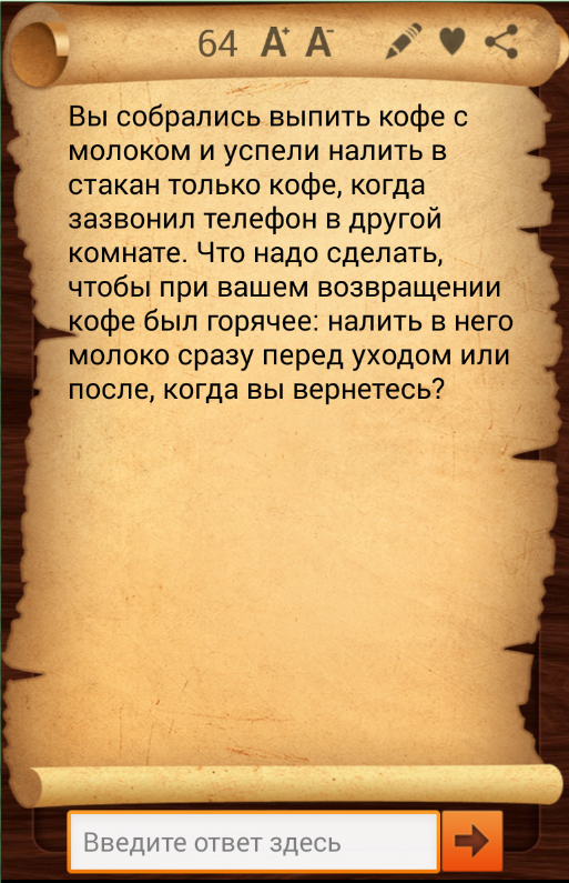 Одна из самых известных андроидных логических игр, основанная на интеллектуальных и математических задачах. Все игровые головоломки конечно хороши, типа там 100 дверей и подобных, но реальной пользы от них мало. А вот в данной игрушке не только есть возможность как следует и не торопясь подумать, но и очевидная степень полезности! За каждое успешное задание выдаётся определённое количество баллов и в последствии открываются новые, более сложные уровни, которых в игре предостаточно много!