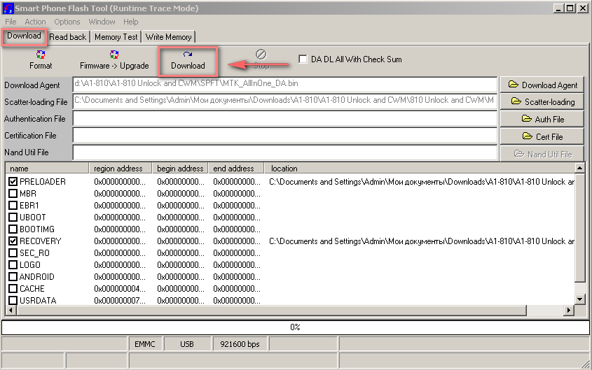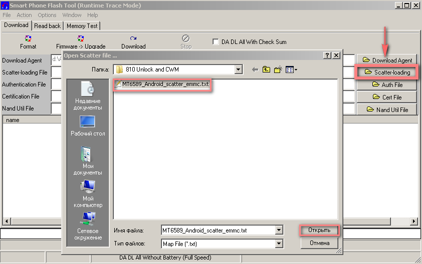 7. Жмёте по кнопке scatter-loading и открываете файл MT6589_Android_scatter_emmc.txt, который находится в папке xxx Unlock and CWM.