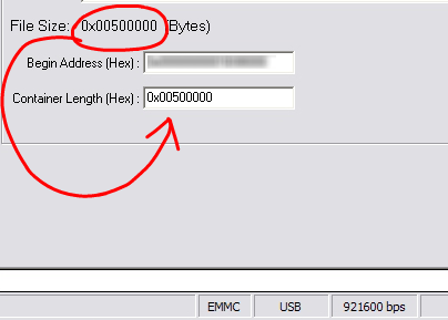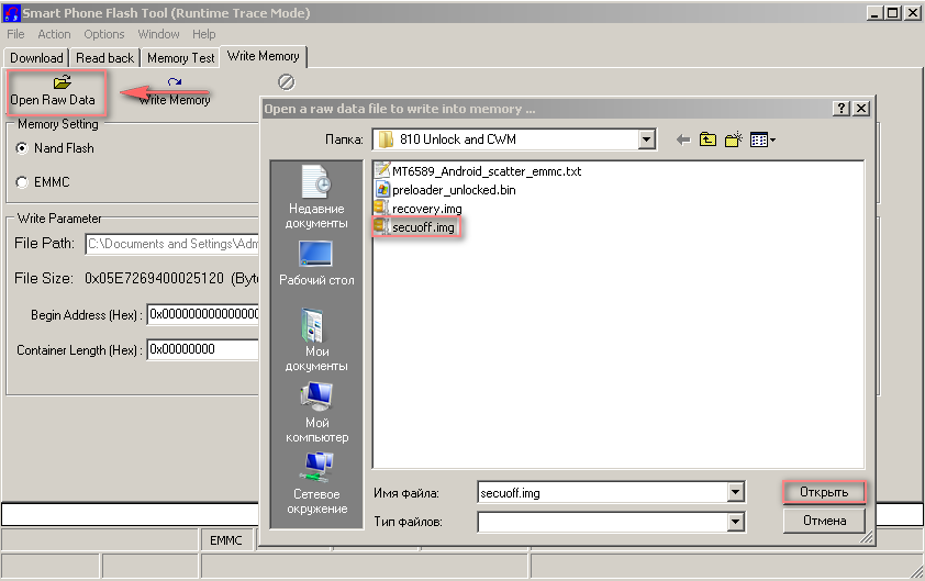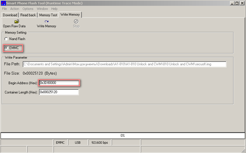 10. Выбираете EMMC в поле Memory setting далее прописываете в Begin Adress: