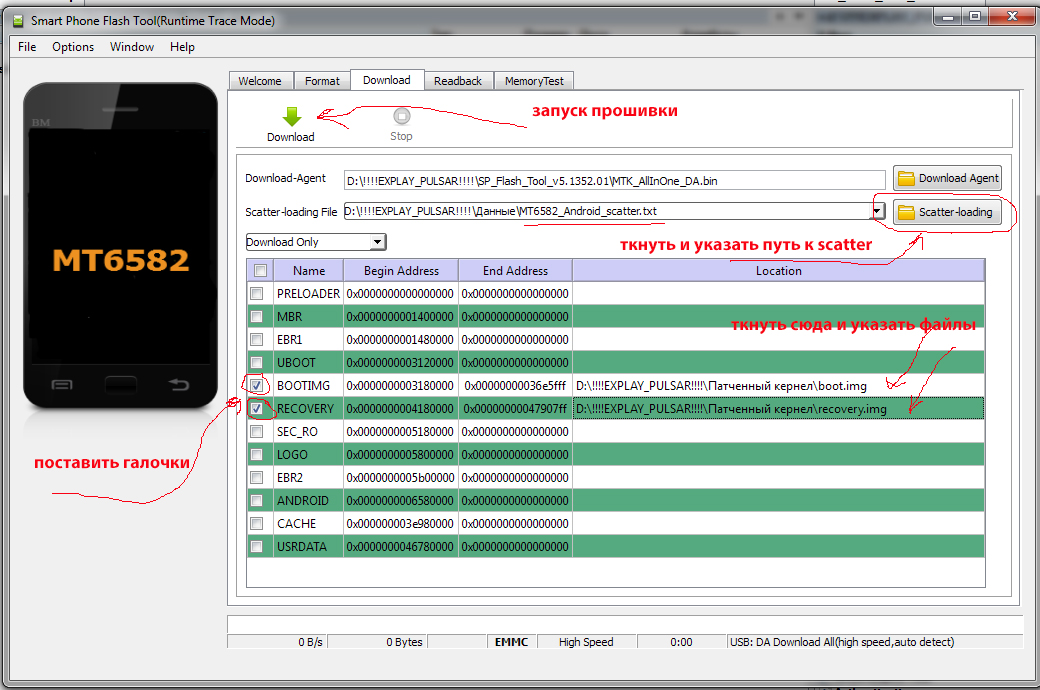 7. Убедитесь что после загрузки scatter файла, напротив BOOTIMG и RECOVERY установлены флажки в окне Flash Tool. Если они не проставились, нажмите на них, и выберите соответствующий файл из папки откуда вы выбрали scatter файл