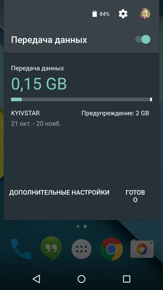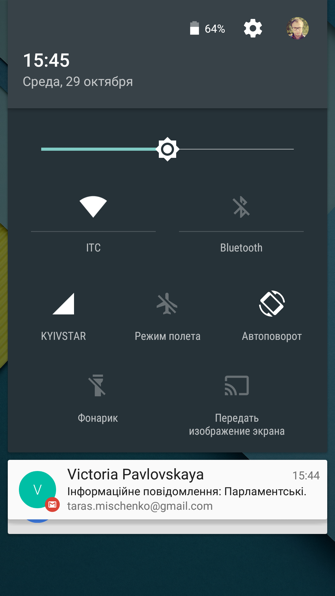 Если Вы один раз потянете от верхней части экрана вниз - отобразятся оповещения. Если протянуть дальше - появится меню быстрых настроек. Здесь можно менять яркость, включать/выключать Wi-Fi, Bluetooth, автоповорот экрана, GPS и передачу изображения с дисплея. Дополнительно можно узнать объём потребленного трафика, активировать режим "в самолёте" и включить фонарик.