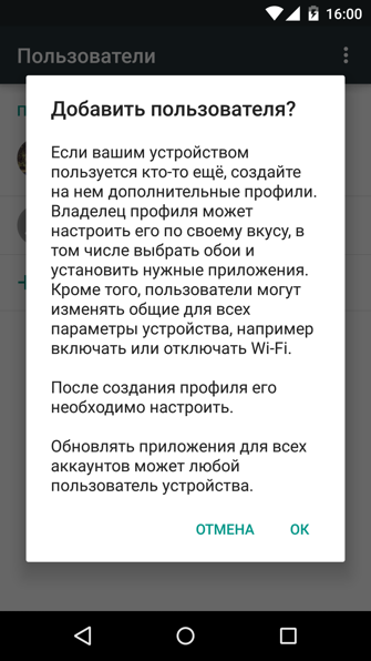 Изначально система предлагает 2 учётные записи - владелец и гость. Но Вы сможете создать дополнительные учётные записи пользователей, привязав к ним отдельный аккаунт от Google. Это позволит устанавливать приложения, которые будут доступны только для определенного пользователя. Владелец устройства не сможет контролировать остальные учётные записи, однако он может ограничить использование голосовых вызовов и смс.