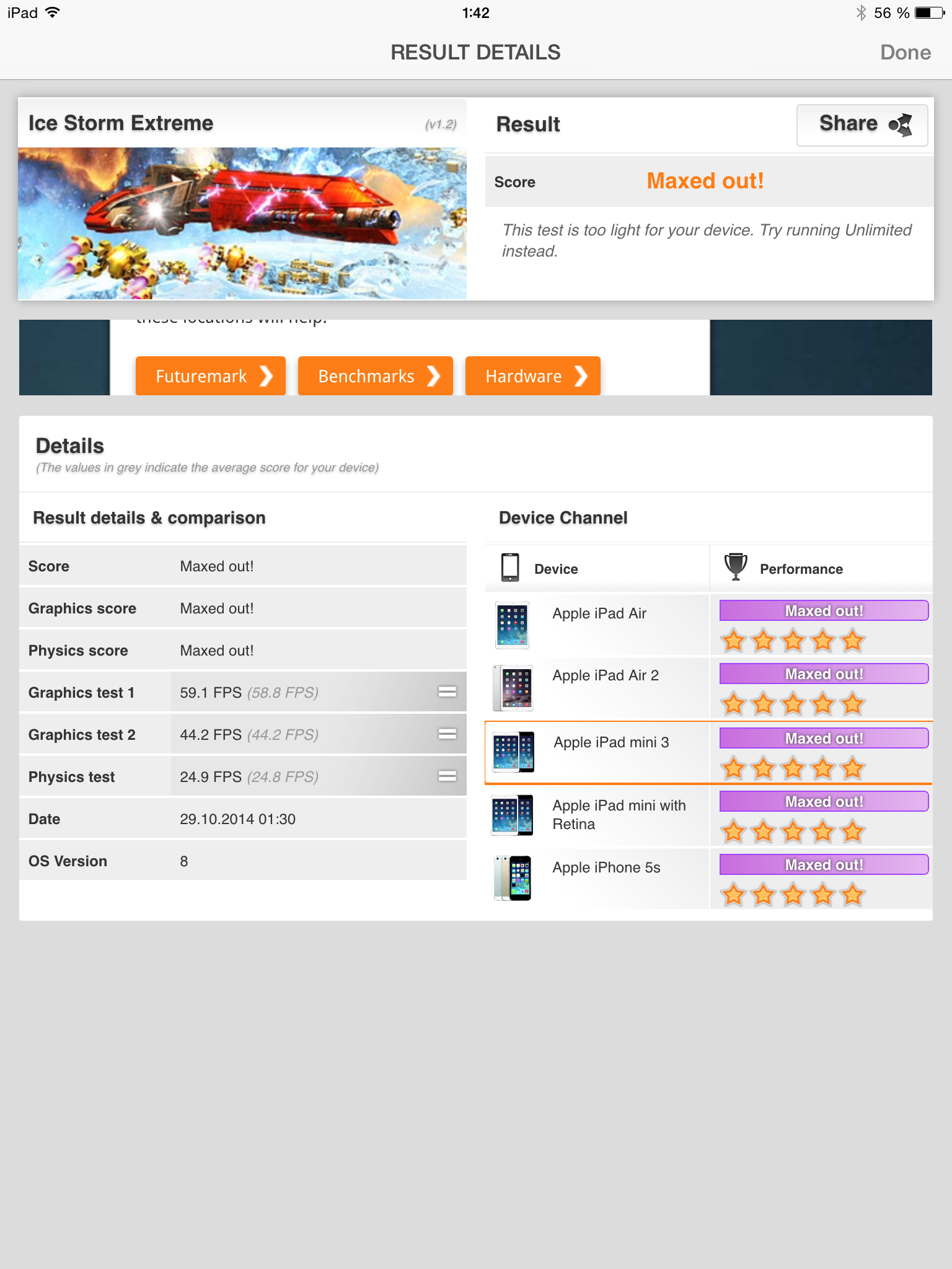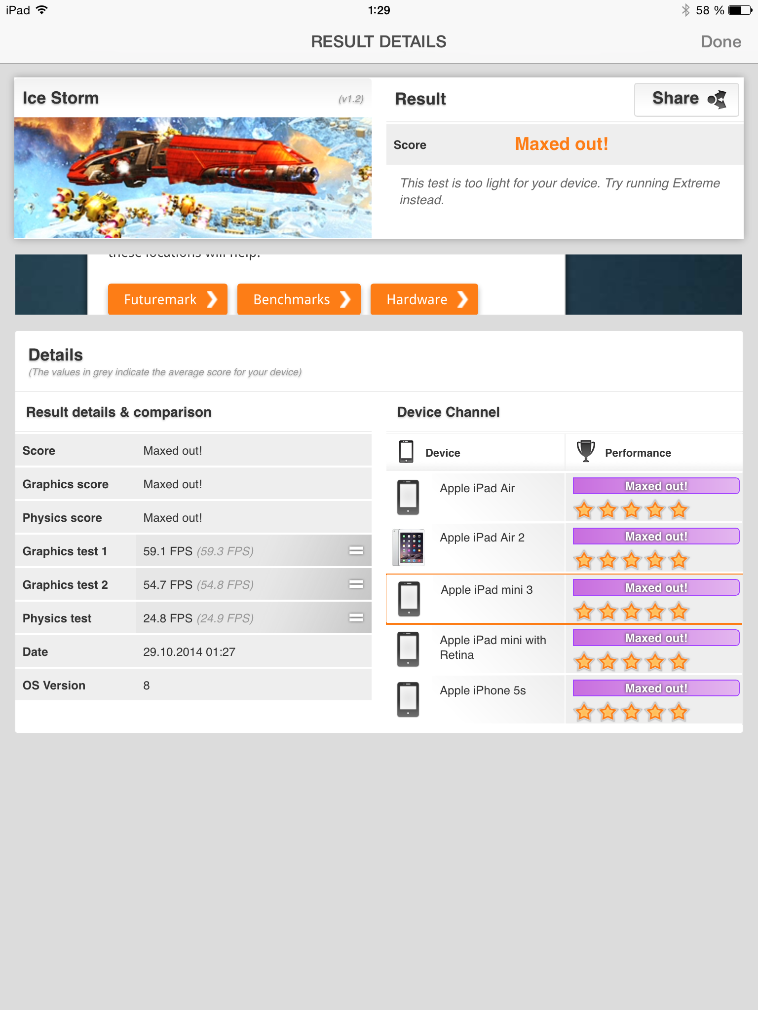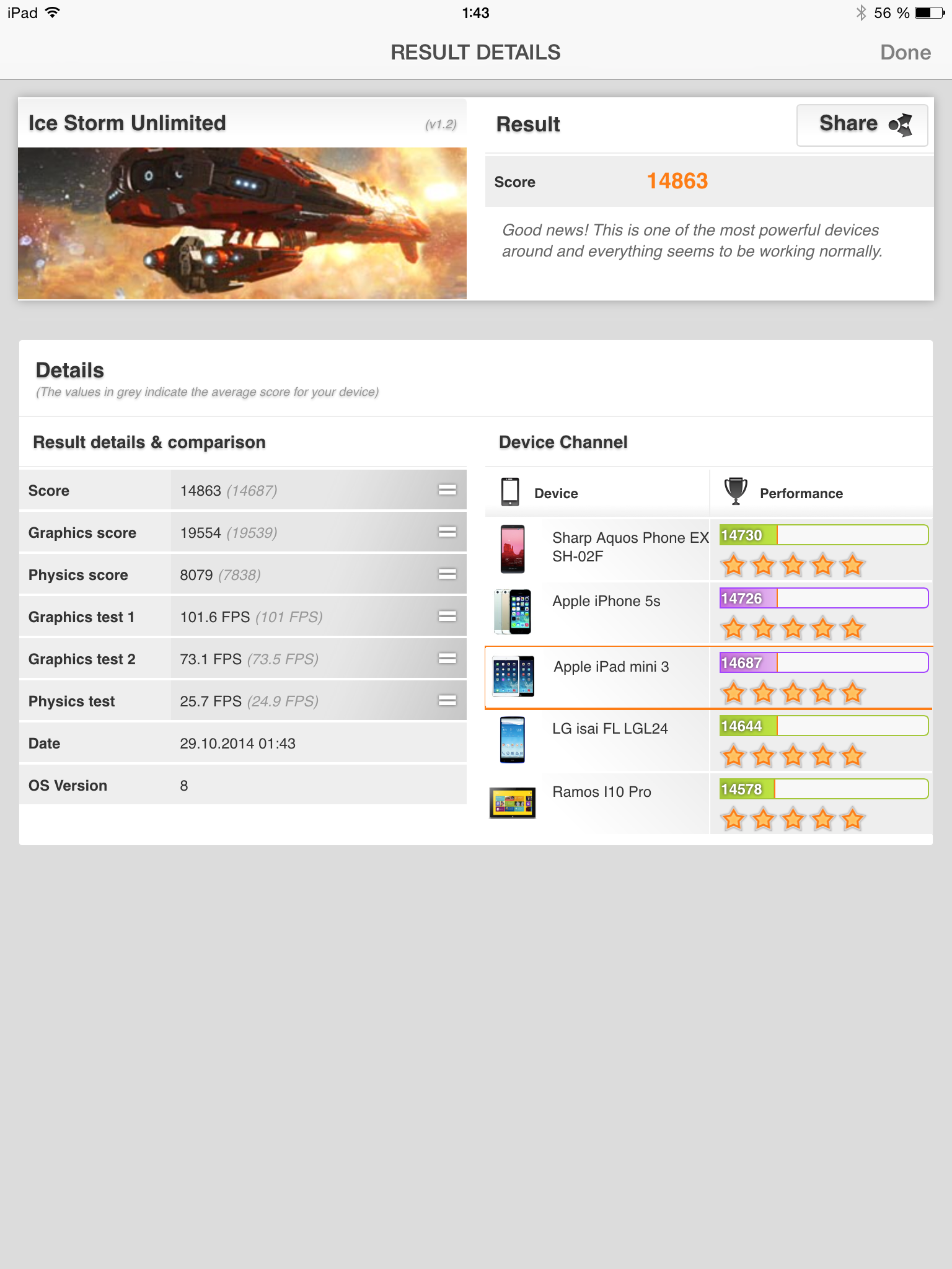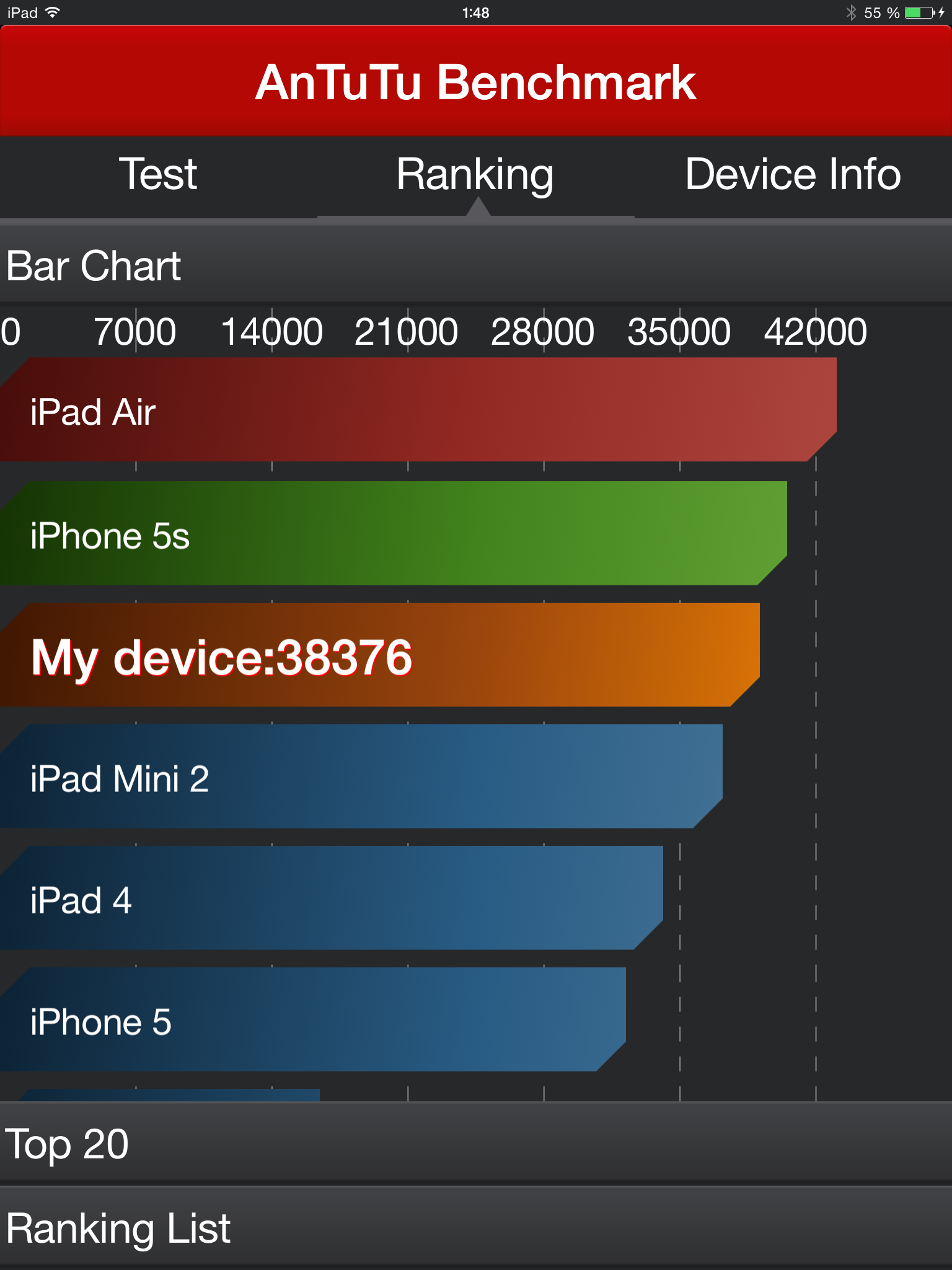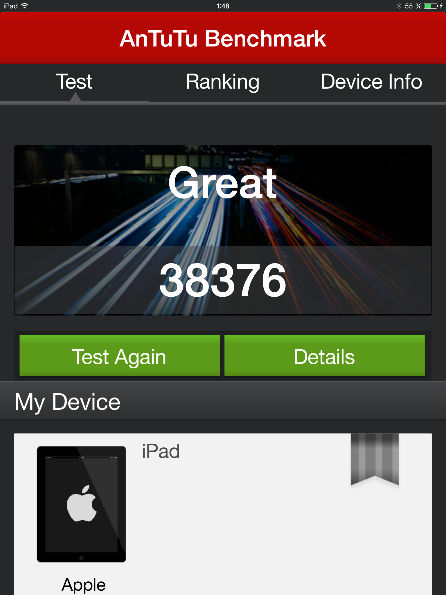 Планшет по-прежнему показывает высокую производительность. В тесте AnTuTu новый iPad набрал 38376 баллов. В 3Dmark тесты Ice Storm и Ice Storm Extreme оказались для него слишком легкими – оба выдали результат «maxed out». В Ice Storm Unlimited планшет получил 14863 балла.