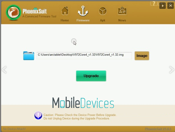 2. Данная инструкция подразумевает, что вы уже нашли прошивку для вашего устройства на Allwinner A31. Запустите Phoenix Suit и если вам будет предложено сделать обновление программы, согласитесь на обновление. Загрузите в PhoenixSuit прошивку для вашего устройства в формате .img через кнопку Image (или Файл).