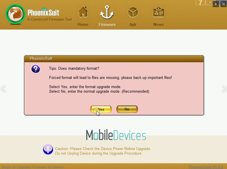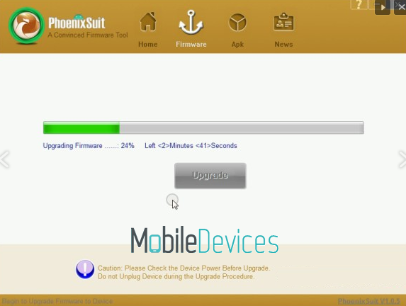 - Не отпускайте кнопку Home, после чего начните отрывисто нажимать на кнопку питания, где-то два раза в секунду пока PhoenixSuit не распознает устройство;