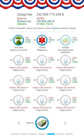 Почувствуйте себя политиком, экономистом и просто первоклассным пройдохой. Выделяйте средства для различных общественных проектов, отмывайте деньги и просто уклоняйтесь от уплаты налогов. Но всё имеет свою цену..... так что вам нужно очень хорошо поработать.