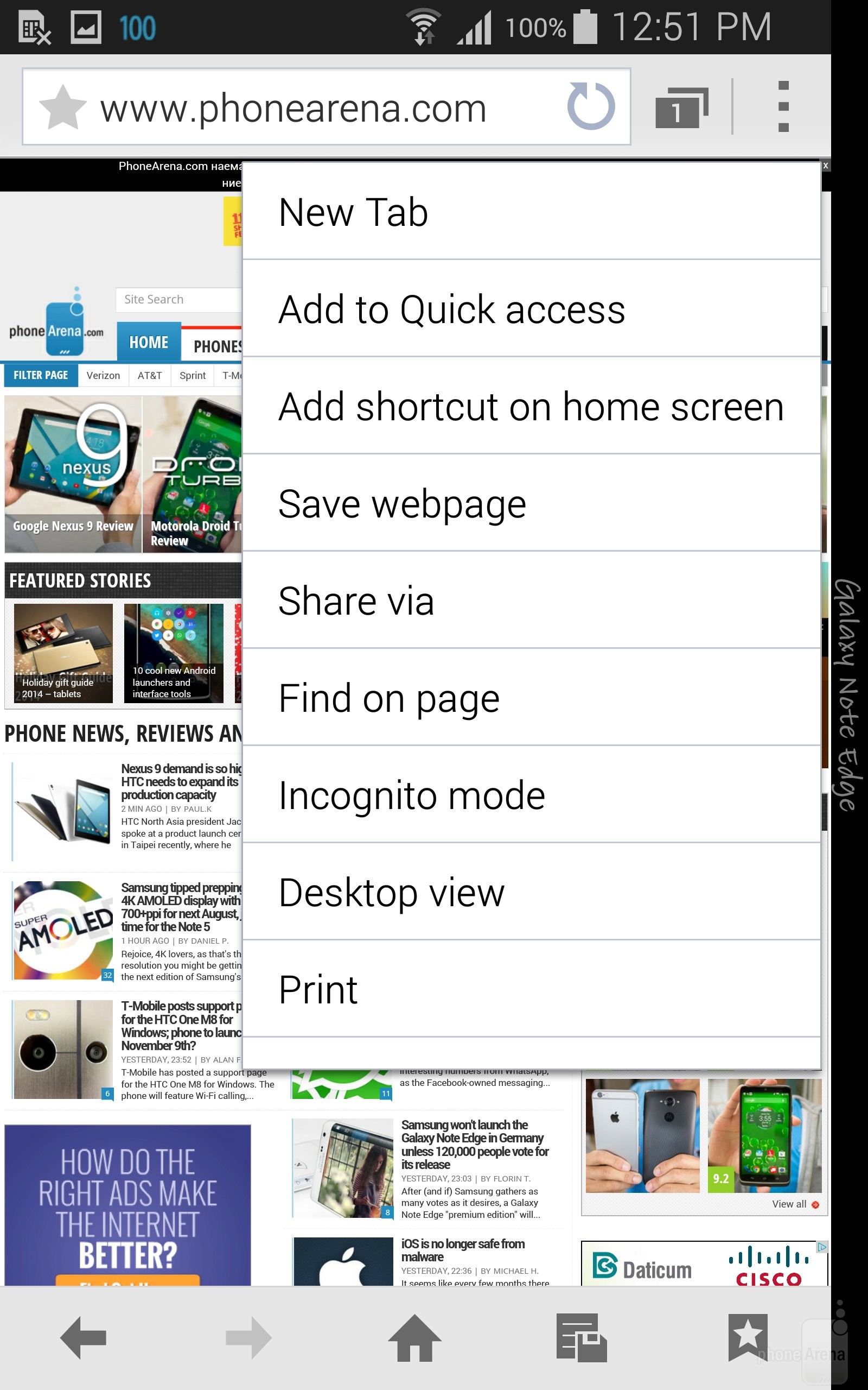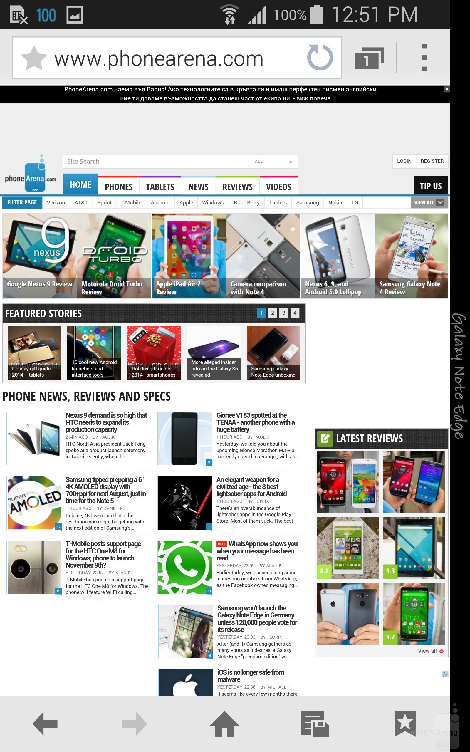 У Вас есть выбор, каким из установленных по умолчанию браузеров Вы будете серфить по Интернету: пользовательским браузером от Samsung или Google Chrome. Единственным преимуществом плохо оптимизированного браузера Samsung – это полноэкранный режим. Однако Chrome гораздо лучше оптимизирован для сенсорных экранов. Рендеринг веб-страниц на Note Edge происходит быстрее, как и прокрутка и увеличение страниц, в то время как в Note 3 присутствует небольшой лаг.