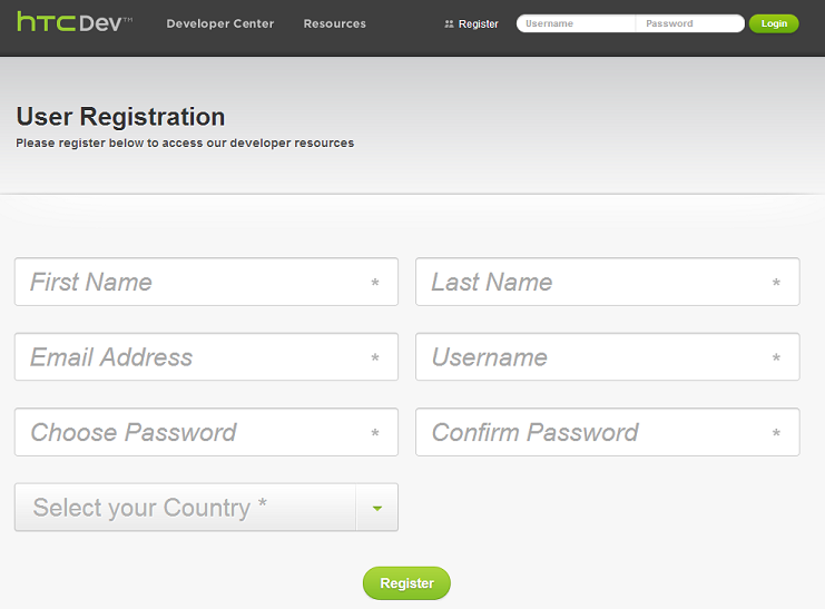 3. Далее вам надо будет зарегистрироваться на сайте http://www.htcdev.com/ (если вы, конечно, еще не зарегистрированы там). Нажмите Register и введите свои данные, после чего проверьте свой email для подтверждения регистрации.