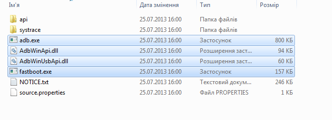 6. Распакуйте скачанный ранее platrom-tools.zip. Здесь нам надо скопировать 4 файла: adb.exe, AdbWinApi.dll, AdbWinUsbApi.dll, fastboot.exe.