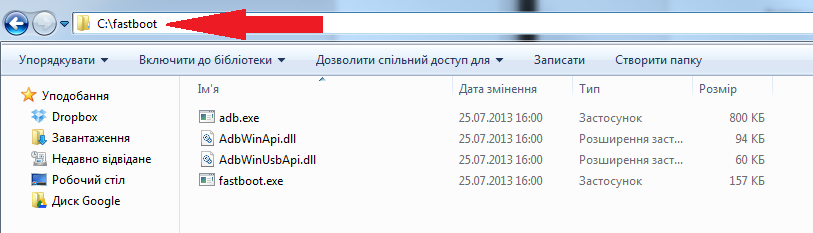 7. Создайте на диске C:\ (обязательно на диске C:\) папку и назовите её fastboot, а затем скопируйте в неё те четыре файла упомянутые в пункте 6 (adb.exe, AdbWinApi.dll, AdbWinUsbApi.dll, fastboot.exe).