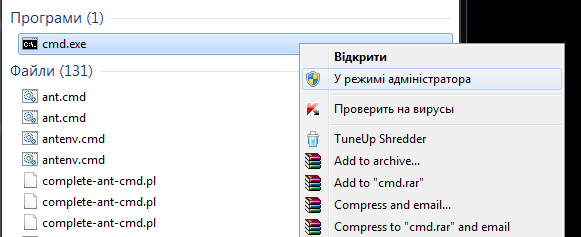 7. В появившейся командной строке вам снова надо указать путь к fastboot папке на диске С, как в пункте 12 по разблокировке11. Для этого нажмите Пуск на компьютере и в поле поиска введите cmd, выберите в результатах поиска cmd.exe и запустите в режиме администратора (правый клик по иконке cmd.exe ---> в режиме администратора).