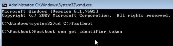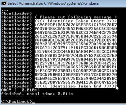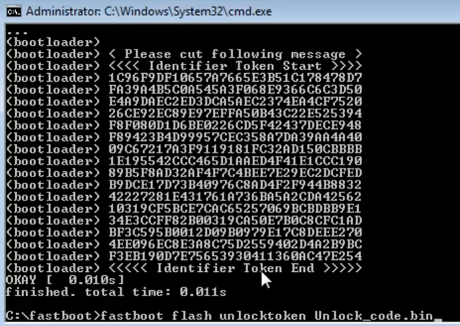 19. Скопируйте только что скачанный Unlock_code.bin в созданную нами ранее папку C:/fastboot и снова откройте командную строку и наберите там следующую команду fastboot flash unlocktoken Unlock_code.bin (последняя строка на скриншоте ниже). Нажмите Enter.