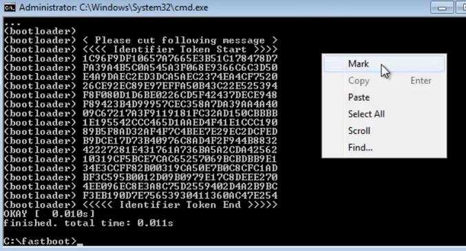 14. Перед вами появится этот самый identifier token, который вам надо будет скопировать. Для чего наведите курсор мышки на окно командной строки, нажмите правую кнопку мыши и выберите из появившегося меню Mark.