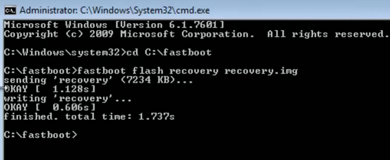8. После этого наберите следующую команду fastboot flash recovery recovery.img и нажмите Enter. Clockworkmod Recovery будет установлен на ваше устройство.12. Теперь нам надо указать путь к fastboot папке которую мы создали на диске C. Для этого наберите в командной строке cd C:/fastboot и нажмите Enter. Все мы в папке C:/fastboot.