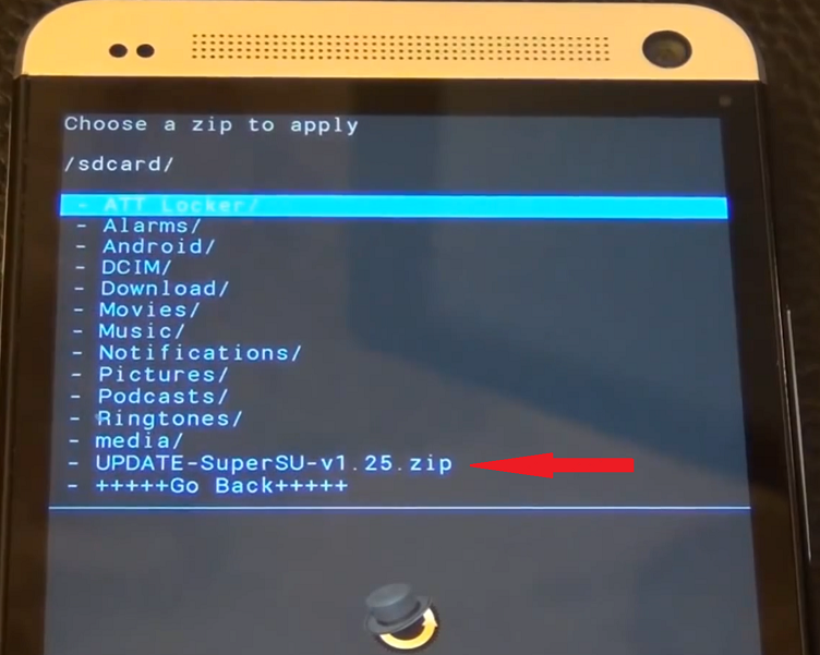 14. Теперь выберите сброшенный вами ранее на внутреннюю sd карту, SuperSU файл и нажмите кнопку питания для выбора.