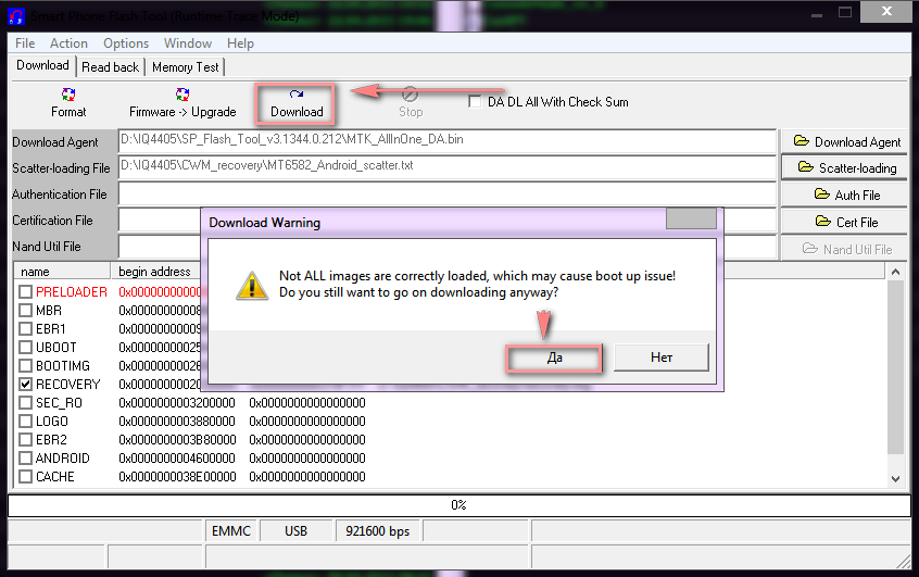 5. Нажать в программе на кнопку Download, в сплывшем окне ДА, затем, сразу, подключить выключенный телефон к компьютеру, если драйвера установлены, то прошивка начнётся сразу после подключения к ПК (пробежит красная, затем жёлтая полоски).