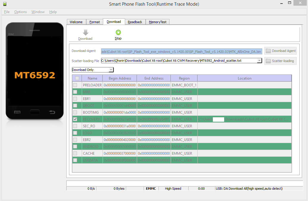 6. Убедись что в окне Flash Tool установлен флажок только напротив RECOVERY и после этого нажми на кнопку Download в окне программы (см. скриншот ниже)