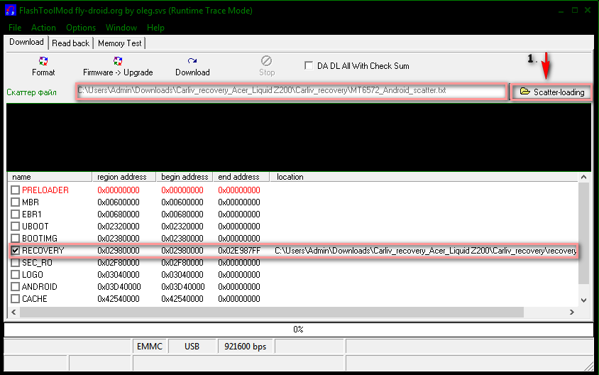 4. Запустить SP Flash Tool, нажать кнопку scatter-loadig и выбрать файл MT6572_Android_scatter.txt из папки Carliv_recovery. Sp Flash Tool подгрузит образ с рекавери, всё должно выглядеть так, как на скриншоте ниже: