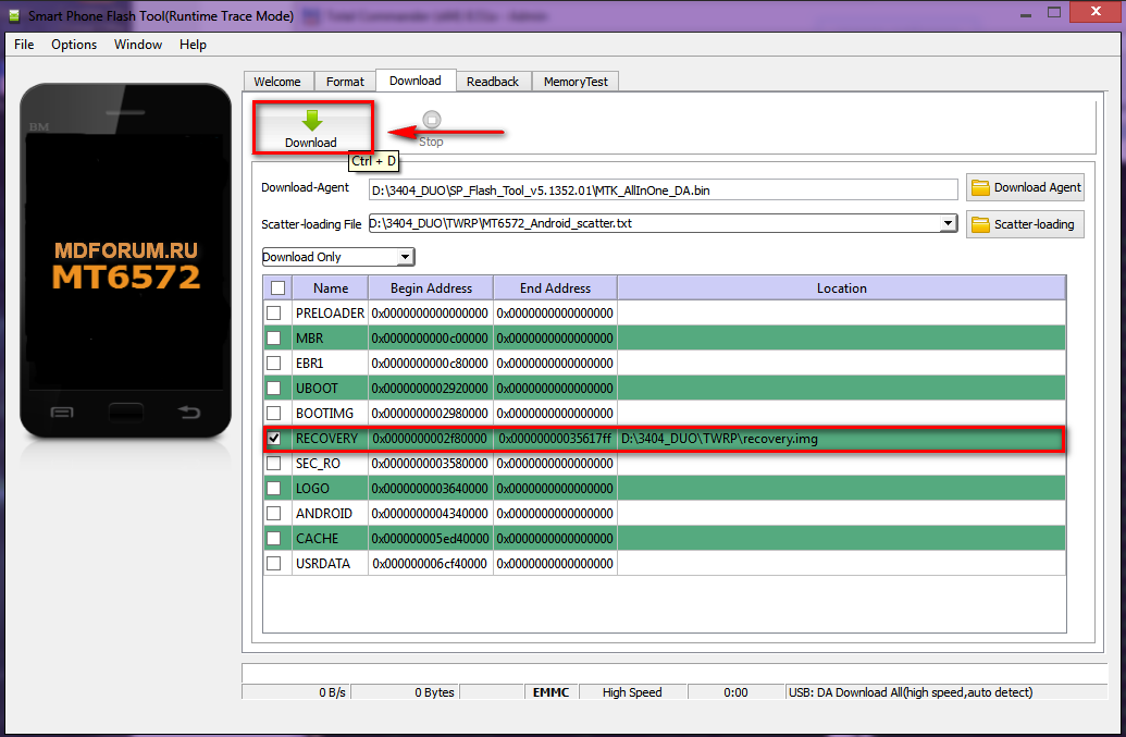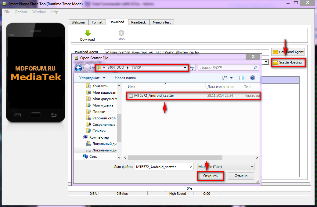 5. Нажать на кнопку scatter-loading и выбрать файл MT6572_Android_scatter.txt, который лежит в папке TWRP.
