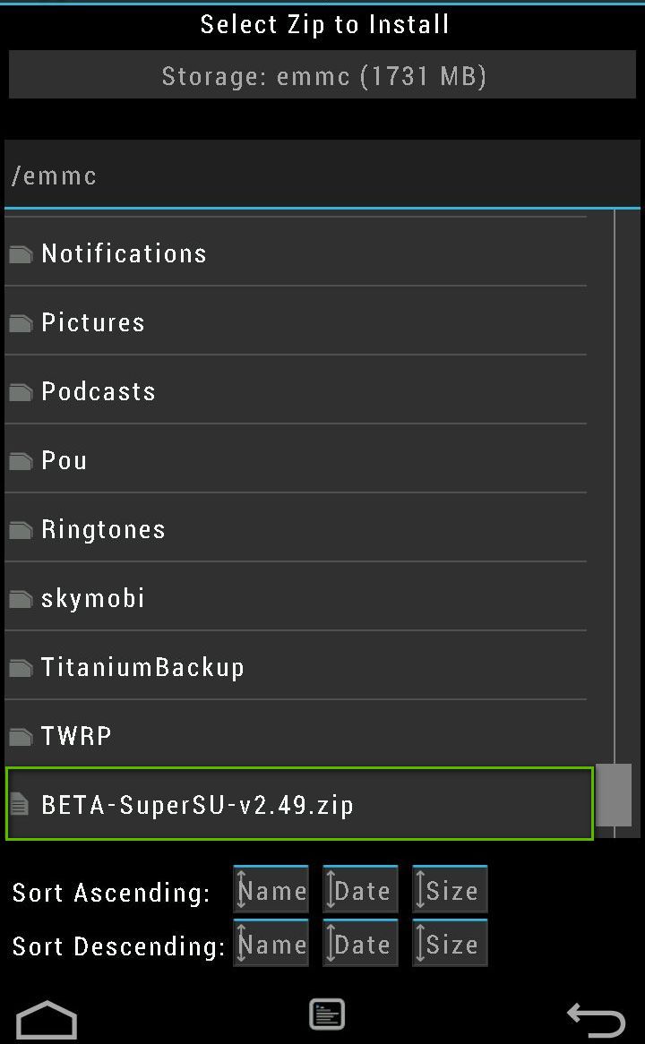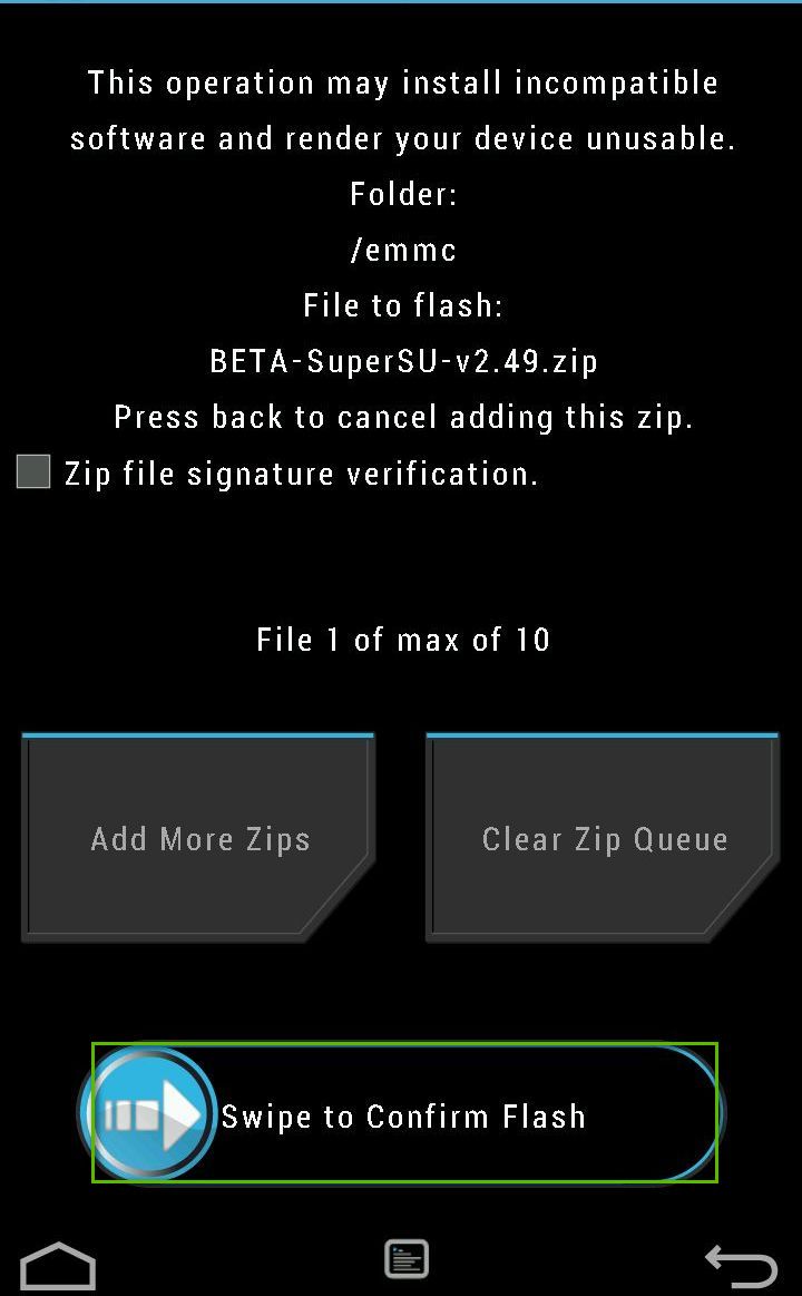 10. После загрузки в TWRP выбрать пункт Install -> далее в проводнике опустится в самый низ -> выбрать архив BETA-SuperSU-v2.49.zip и установить проведя пальцем внизу экрана (Swipe to confirm flash). После установки архив выбрать пункт Reboot system, после чего телефон загрузится в систему уже с рутом.