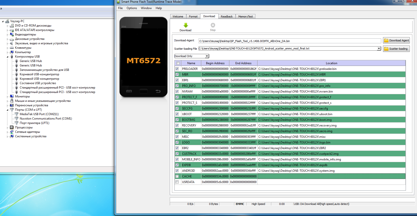 В итоге должны быть две пустые строчки (без галок и путей к файлу CHACHE и USERDATA). Нажимаете на верхней панели Download.[Новый точечный рисунок (2).bmp/QUOTE]