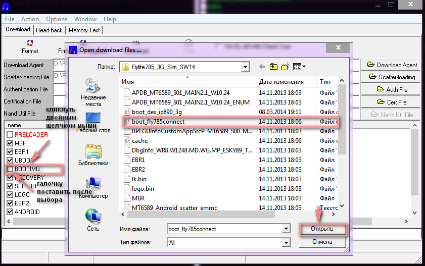 Примечание для SW14: в папке с прошивкой находится два ядра (по дефолту выбирается от Dexp ip890, смените его, если нужно на родное boot_fly785connect.img)