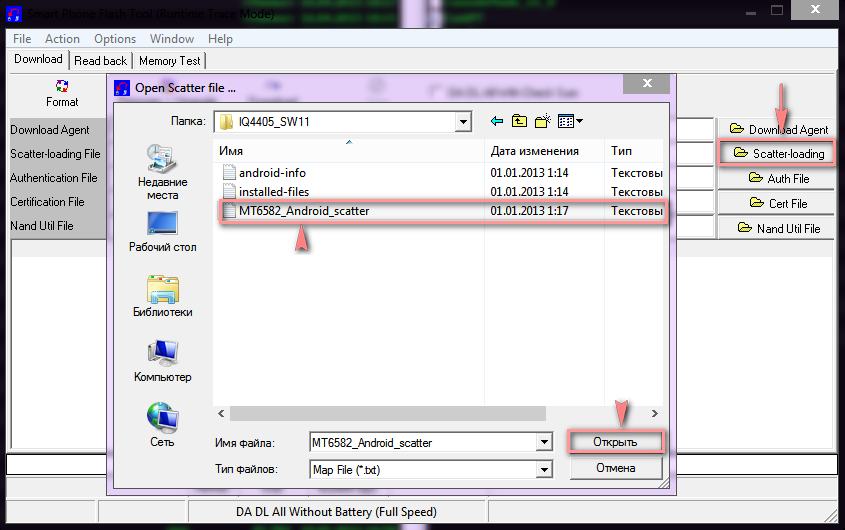 3. Запустить SP Flash Tool, нажать scatter-loading и указать путь к файлу MT6582_Android_scatter.txt, который лежит в папке с прошивкой.