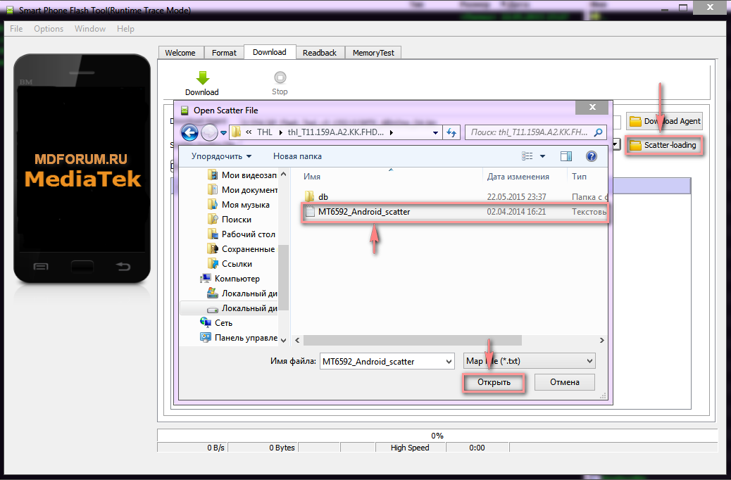 5. Нажать scatter-loading и выбрать файл MT6592_Android_scatter.txt, который находится в папке с прошивкой.