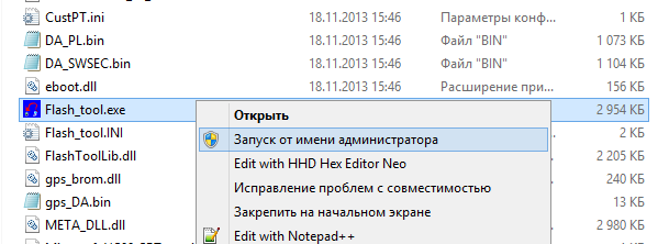 2. Скачиваем архив SP_Flash_Tool_v3.1336.0.198.zip, опять же внизу данного сообщения. Распаковываем, заходим в папку, находим там Flash_tool.exe и запускаем его на правах администратора, для этого делаем клик правой кнопкой мышки по нему и выбираем "Запуск от имени администратора".