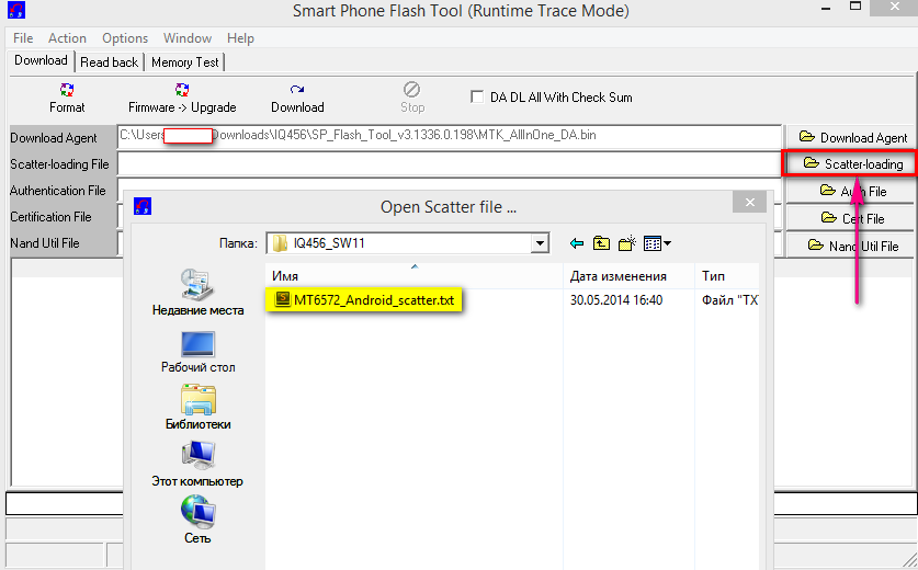 3. Нажимаем на кнопку Scatter-loading и в окне обзора файлов переходим в папку с прошивкой, после чего выбираем там файл MT6572_Android_scatter.txt (он там будет один единственный доступный для выбора в папке с прошивкой, так что не промахнётесь).