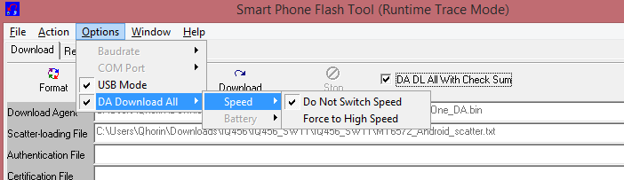 4. В настройках программы выбираем Options -> DA Download All -> Speed -> Do Not Switch Speed, а так же ставим флажок напротив DA DL All with Check Sum.