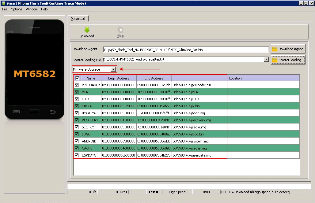 1. Скачать архив с прошивкой, распаковать. 2. Установить драйвера для Sp Flash Tool. 3. Скачать утилиту для прошивки Sp Flash Tool нужной версии из вложения к этому посту, распаковать. 4. Прошиться следуя этой инструкции Краткая инструкция по установке стоковой прошивки через SP Flash Tool. Только прошивать через режим Firmware-Upgrade. У вас всё должно выглядеть так, как на скриншоте ниже: