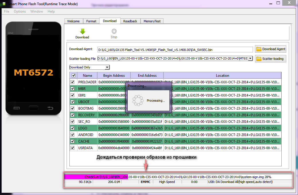 - Дождаться пока SP Flash Tool проверит целостность образов прошивки (пробежит фиолетовая полоса)