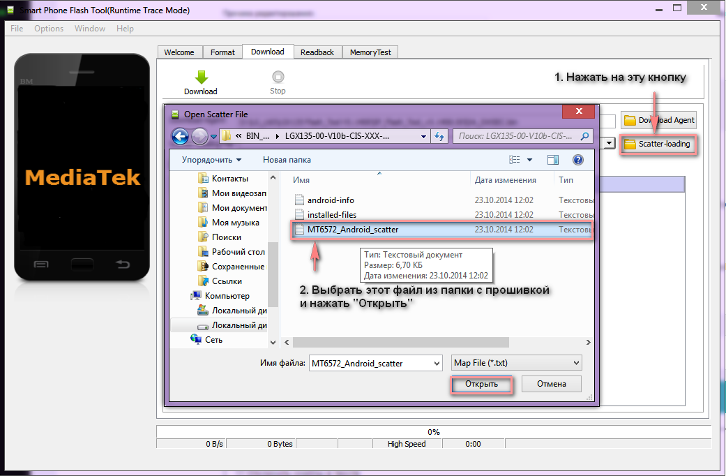 - Нажать на кнопку Scatter-loading и выбрать файл MT6572_Android_scatter.txt из папки с прошивкой.
