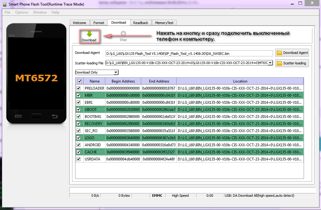 6. В программе нажать на кнопку Download и подключить выключенный телефон к компьютеру, если драйвера были установлены то прошивка начнётся автоматически (пробежит красная, затем жёлтая полоска).