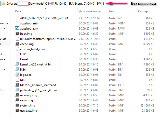 1. Скачайте архив с прошивкой на Fly IQ4401 для SP Flash Tool. Распакуйте архив в отдельную, пустую папку. Название папки в которой будет содержаться прошивка должно иметь в своём названии только англ. буквы и цифры, кириллица или иероглифы не допускаются. Прошивка представляет из себя набор файлов .img, .bin и так далее (см. скриншот ниже).