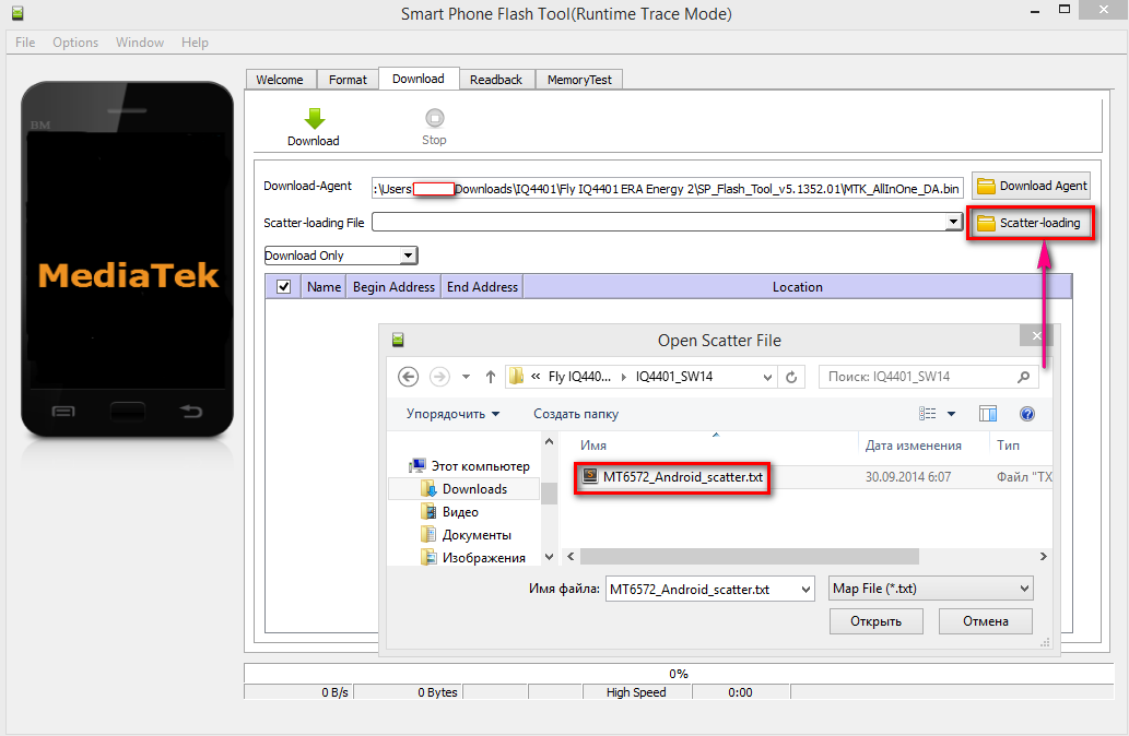 3. Нажимаем на кнопку Scatter-loading и переходим в папку с прошивкой, и там выбираем файл MT6572_Android_scatter.txt.