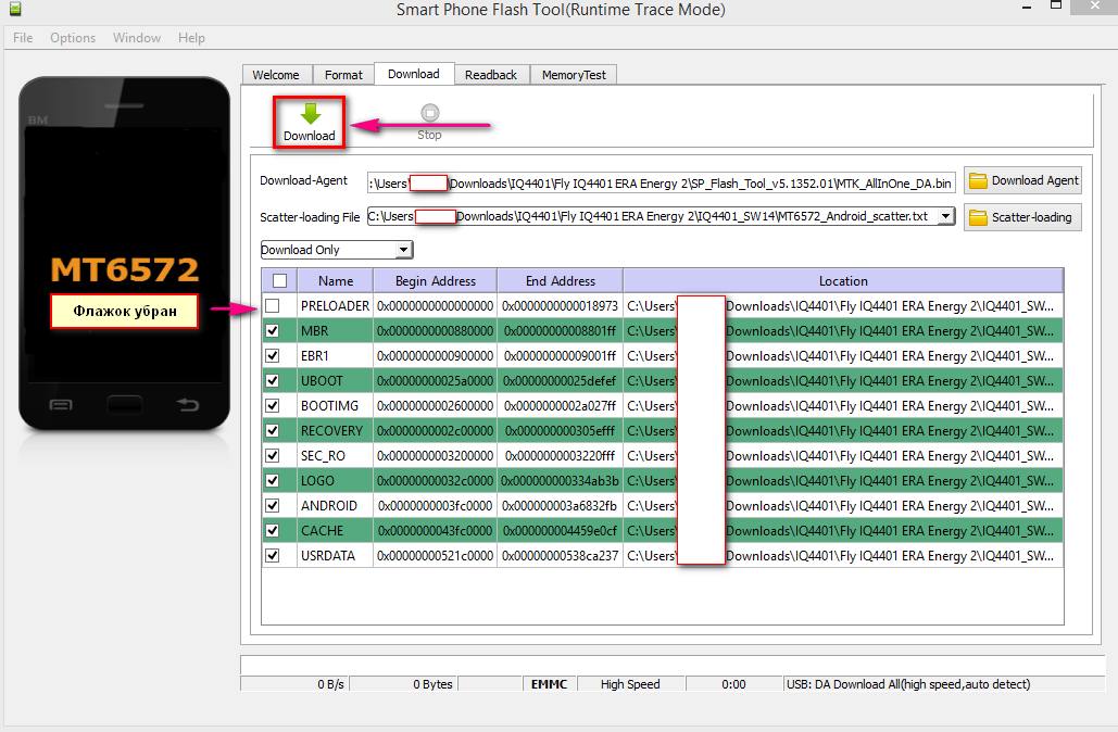 4. Снимаем "галку" напротив PRELOADER и нажимаем Download, так как раздел PRELOADER, лишний раз, лучше не прошивать. Однако, если у вас "кирпич", то есть смартфон находится в нерабочем состоянии, или же вы выполняете понижение версии прошивки, то оставьте флажок напротив PRELOADER и выберите режим прошивки Firmware Upgrade, после чего нажмите Download.