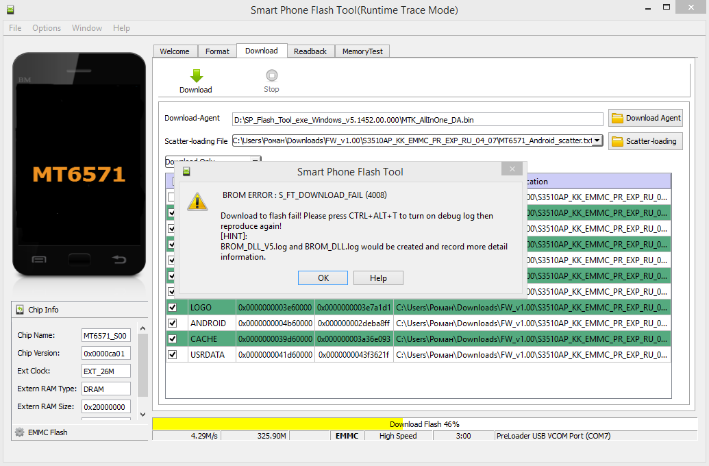 5. Далее, выключаем смартфон, вытаскиваем батарею, вставляем её обратно, но устройство не включаем. Подключаем выключенный смартфон к компьютеру через USB кабель, если всё было сделано верно, Flash Tool сам начнёт прошивку, автоматически. Если прошивка не начнётся сама, то, скорее всего вы не установили драйвера как это сказано в первой части инструкции