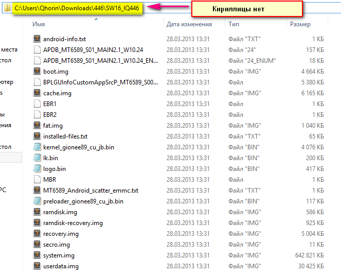 1. Скачиваем прошивку, вернее архив с прошивкой и распаковываем архив в отдельную, пустую папку. Папка в которой содержится прошивка должна иметь в названии только цифры или английские буквы, никаких русских или других кириллических символов или иероглифов. Кроме того, сам путь, где будет располагаться прошивка, тоже должен содержать только латиницу или цифры. Пробелов тоже не должно быть (смотрим скриншот ниже):