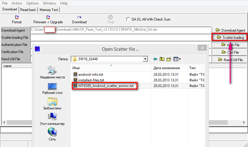 3. Открывается окно программы, здесь нажимаем на кнопку Scatter-loading, которая расположена в правой части окна утилиты. Появится окно обзора файлов, перейдите в нём в папку с прошивкой и выберите файл MT6589_Android_scatter_emmc.txt: