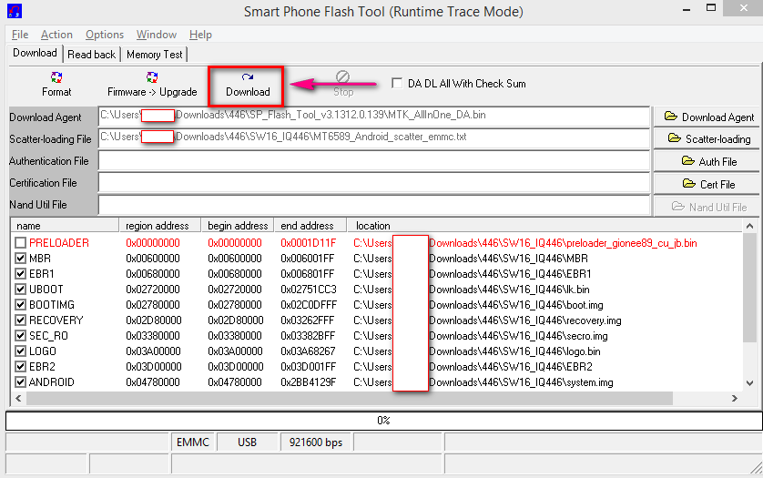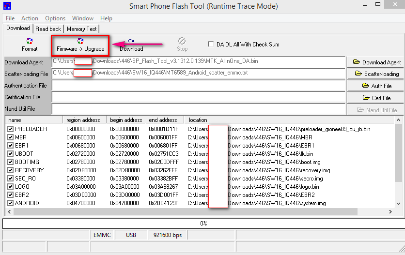 4. Дальше, убираем флажок напротив пункта PRELOADER и нажимаем на кнопку Download, поскольку прошивать данный раздел, без надобности, не надо. Однако, если вы выполняете понижение прошивки или же смартфон у вас "кирпич", то есть не включается вообще, то оставьте флажок напротив PRELOADER, а вместо Download нажмите кнопку Firmware -> Upgrade: