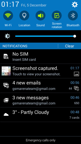 Область уведомлений похожа на те, что Вы уже видели на последних Galaxy устройствах, но в ней отсутствую некоторые функциональные особенности. Быстрая настройка и S Finder все еще присутствуют, но раскрыть панель, чтобы просмотреть все кнопки быстрой настройки, у Вас не получится, Вам нужно будет каждый раз пролистывать их, чтобы найти необходимую. Но вы все еще можете поменять их порядок. Чуть ниже кнопок быстрых настроек расположилась шкала яркости и сами уведомления.