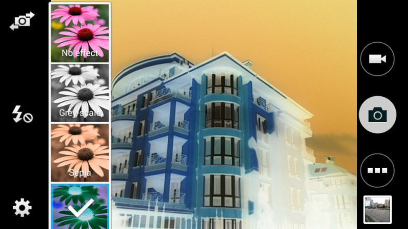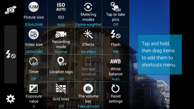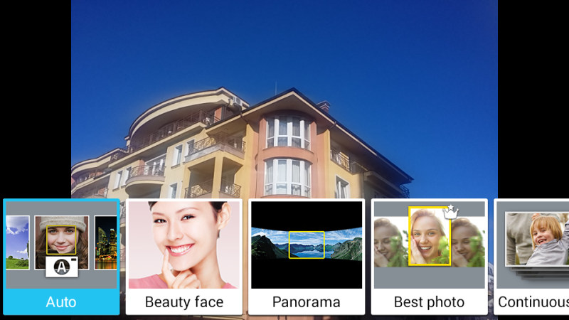 Приложение камеры имеет стандартный интерфейс TouchWiz, хотя в нем отсутствуют некоторые функции, присутствующие в флагманских моделях. Приложение предлагает настройки ISO, экспозиции, регулировку баланса белого, различные эффекты и геотегинг. Специальные режимы съемки включают панораму, «Лучшее фото» и непрерывную съемку, плюс ситуационные режимы Ночной и Спорт. Странно, но здесь нет HDR режима.