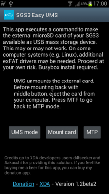 Как известно, в прошивке ICS и выше пропала возможность монтировать карту памяти в качестве съемного диска на ПК. Вместо этого появился режим MTP, который не всегда удобен в использовании. SGS3 Easy UMS исправляет это недоразумение, позволяя смонтировать внешнюю (только внешнюю!) карту памяти смартфона в качестве съемного диска.