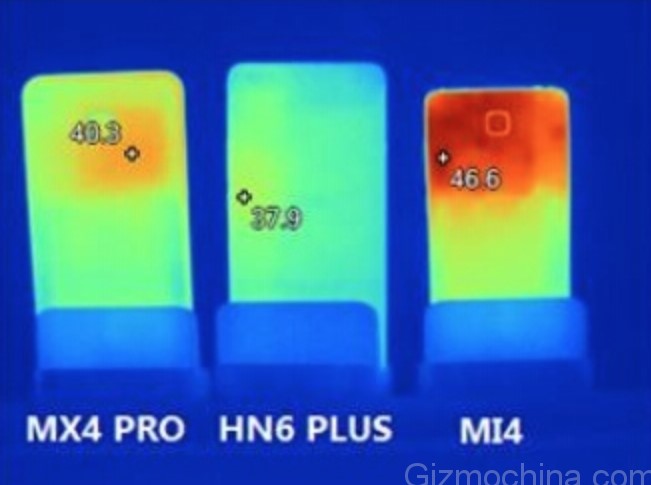 Сам тест интересен не только потому что мы не каждый день смотрим на телефоны через тепловизор, но и потому, что все 3 представленные модели используют различные чипсеты. Meizu MX4 Pro оснащен восьмиядерным Samsung Exynos 5430 с тактовой частотй 2ГГц, Huawei Honor 6 Plus использует собственный восьмиядерный Kirin 925 с тактовой частотой 1,8ГГц, а Xiaomi Mi4 достался чипсет Snapdragon 801, в котором тактовая частота четырех ядер (2,5ГГц) больше, чем у предыдущих моделей.
