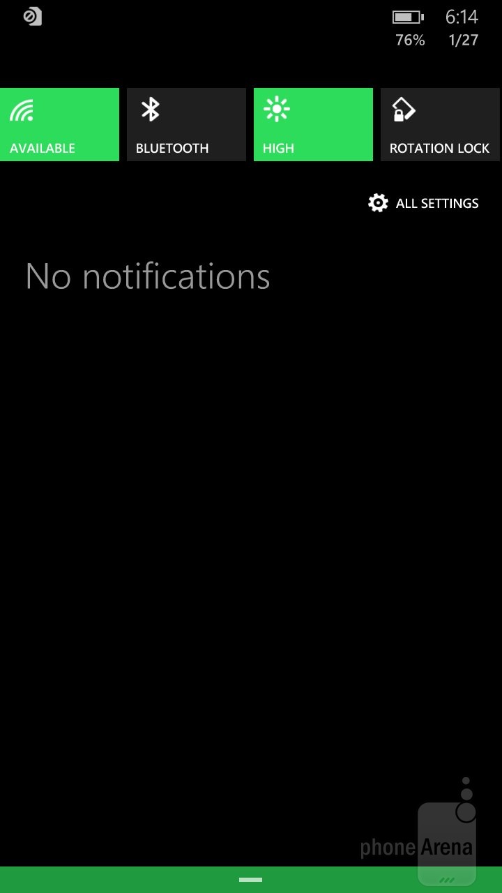 Lumia 830 собрал лучшее, что может предложить платформа от Microsoft в настоящее время, тем более эта модель смартфона уже стоит в очереди на получение обновления Windows 10. Windows Phone 8.1 привнесла множество новый функций, включая центр уведомлений, который появляется вместе в выдвигающейся панелью вверху экрана, и кнопки быстрого доступа (аналогично Android). Раньше необходимо было каждый раз заходить в настройки, когда Вам нужно было переключить уровень яркости, теперь же с появлением выдвижной панели этот процесс будет занимать пару секунд. Также в центре уведомлений Вы можете следить за остатком заряда батареи в процентах и посмотреть точную дату. Уведомления, приходящий на Ваш смартфон, удаляются также, как и в Android, простым свайпом вбок или же кнопкой для очистки всех уведомлений сразу.