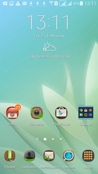 Рабочий стол выглядит также традиционно, с четырьмя колонками для приложений. Всего Вы сможете иметь до 5 рабочих столов. Крайний левый рабочий стол предназначен для Ваших социальных новостей. Вы сможете выбрать темы, которые Вам интересны, и использовать для этого различные сервисы.