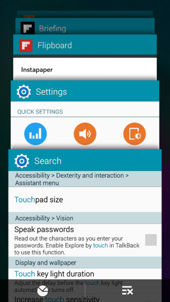 Переключатель приложений использует дизайн Lollipop, но функционал остался прежним.